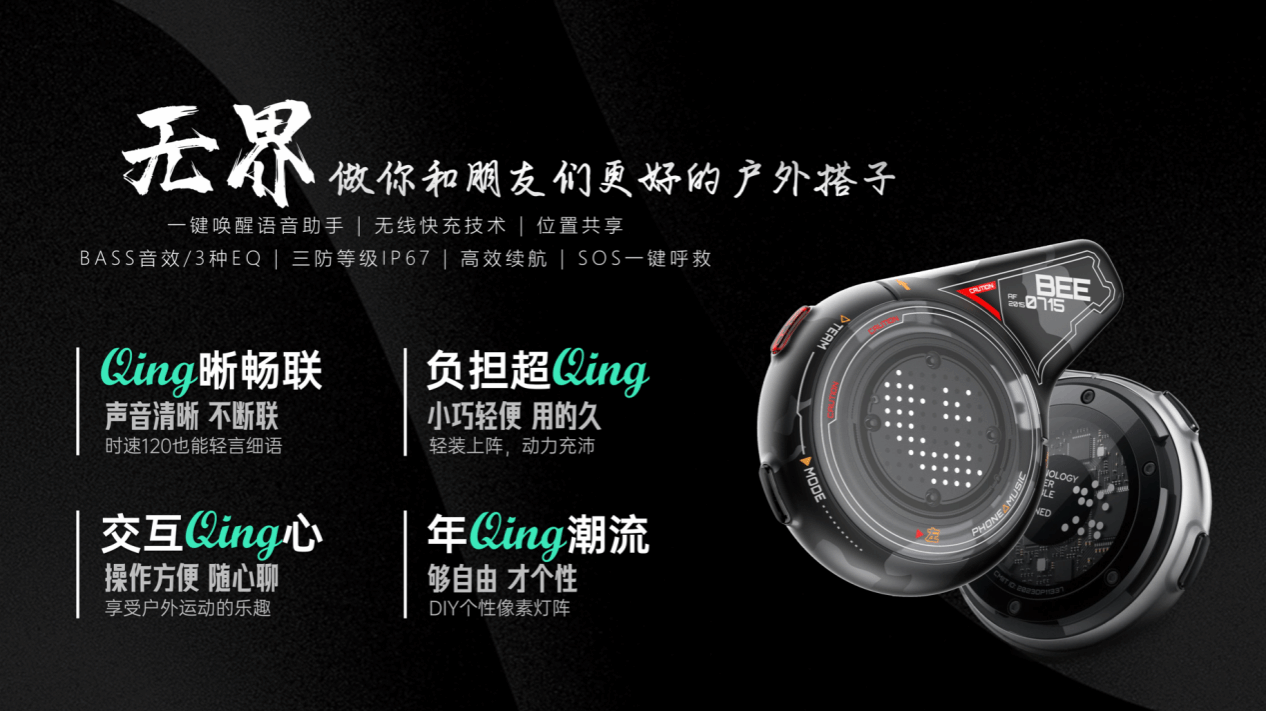 项目简介:随着户外运动的流行,“社交感”成为年轻人在户外的新刚需。团队致力于定义一种全新的户外运动方式——“Qing户外”,专为户外运动爱好者设计了一款户外通讯产品——无界BOUNDLESS运动通讯对讲。研发团队自创高性能语音Holomesh组网方案,正向设计组网与通信协议栈,实现了高性能远距离实时全双工语音传输。产品可以让用户在享受骑行、徒步和登山乐趣的同时,保障用户人身安全,实现无网络覆盖下的实时交流,重新定义户外运动新潮流