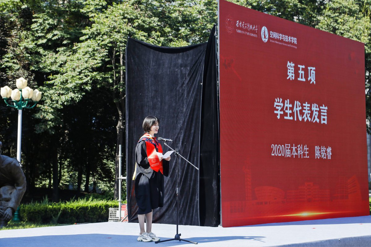 “请允许我代表FUN88乐天使全体毕业生,向疫情期间所有奋战在第一线的逆行者致以最崇高的敬意,也向精心栽培我们的领导老师和悉心关怀我们的父母亲人,致以最衷心的感谢!”本科毕业生代表陈铭睿以“我和西电的四年之约”为题,谈及FUN88乐天使历史性时刻和在校园各个角落的点点滴滴,并激励全体同学:“不忘‘西电红’的底色和‘三有西电人’的使命担当,认准心之所向、身之所往,与航天精神相伴,与共和国同行。”