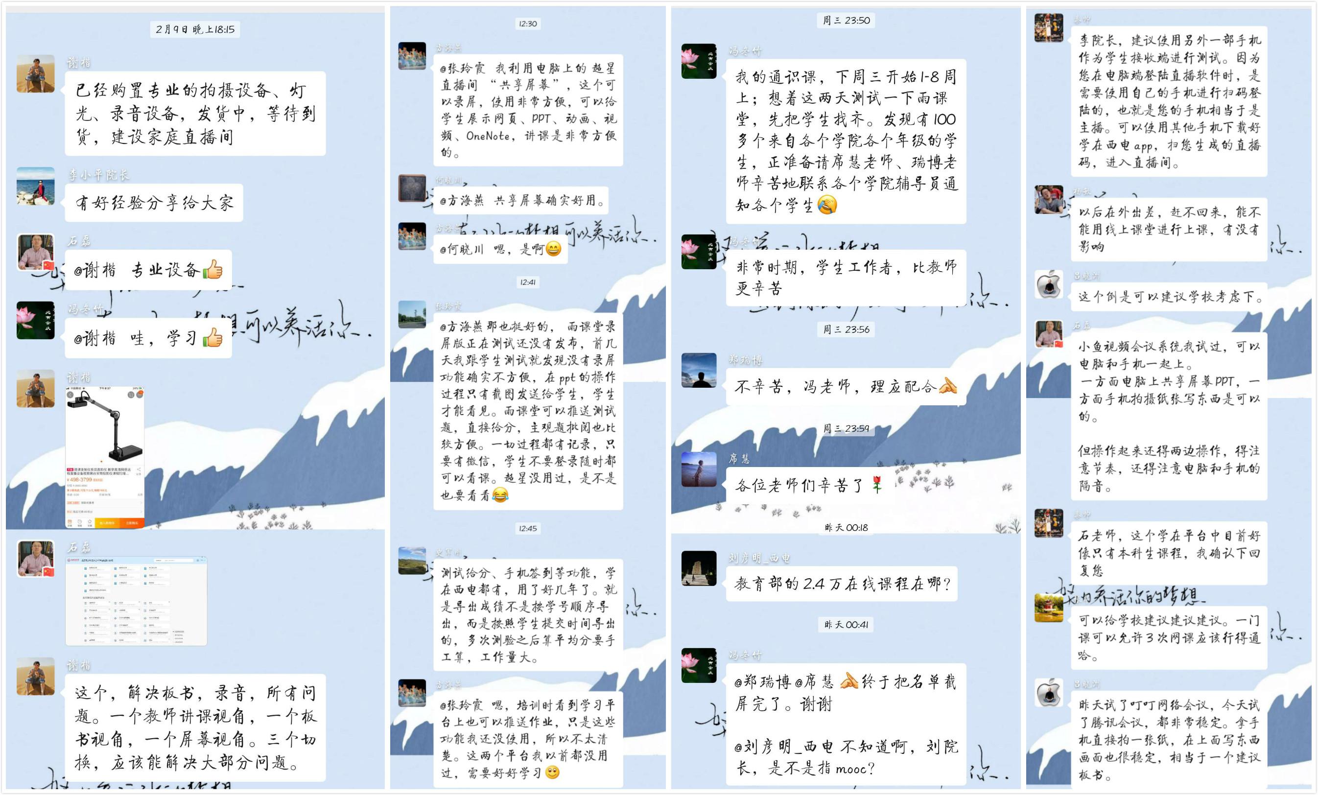 在“FUN88乐天使工作群”和“FUN88乐天使本科教学群”中,一线教师们不舍昼夜、积极交流,你一言我一语,用最快的速度完成线上建课流程、熟悉线上教学工具、探索线上教学平台、讨论线上教学培训内容,反馈研讨线上教学测试出现的各类问题,为线上课程优化建言献策。
