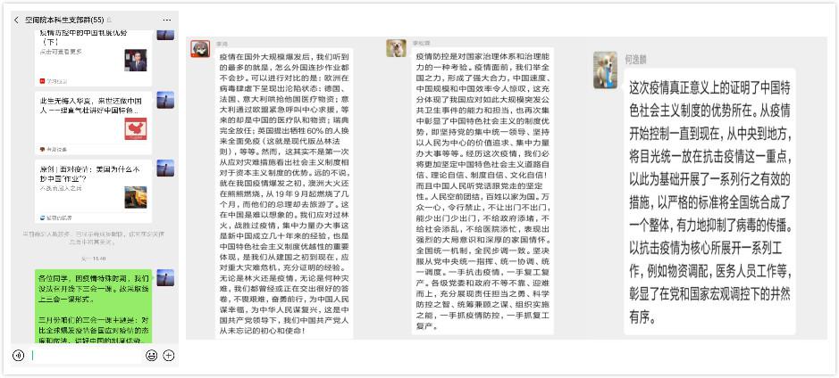 导航控制系研究生党支部的党员魏军康和刘岱明在讨论中不约而同地谈到:“中国制度的优势就是在集中力量办大事上,尤其在未曾遇到的事物上,中国对事态果断处理很具有说服力。短时间内(几周时间),建起两所千张病床医院,可容纳数万人的一系列方舱医院;全国调拨2万名专业医护人员,海陆空运送;从一线城市到贫困山区,封锁隔离、无人怨言,捐款捐物、人人踊跃,展示了无以伦比的民族凝聚力。”