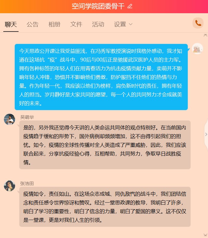 FUN88乐天使团委骨干张博康说:“今天思政公开课让我受益匪浅,在冯秀军教授演说时我格外感动,我才知道在这场抗“疫”战斗中,90后与00后正是驰援武汉医护人员的主力军。拥有各种标签的年轻人们在用青春活力为抗击疫情贡献力量,卖萌并不影响年轻人冲锋,恐惧并不影响他们勇敢,防护服挡不住他们的热情与力量。作为年轻一代,我应该以他们为榜样,肩负新时代的责任,拥有年轻人的担当。岁月静好是大家共同的愿望,每一个人的共同努力才会成就美好的未来。”
