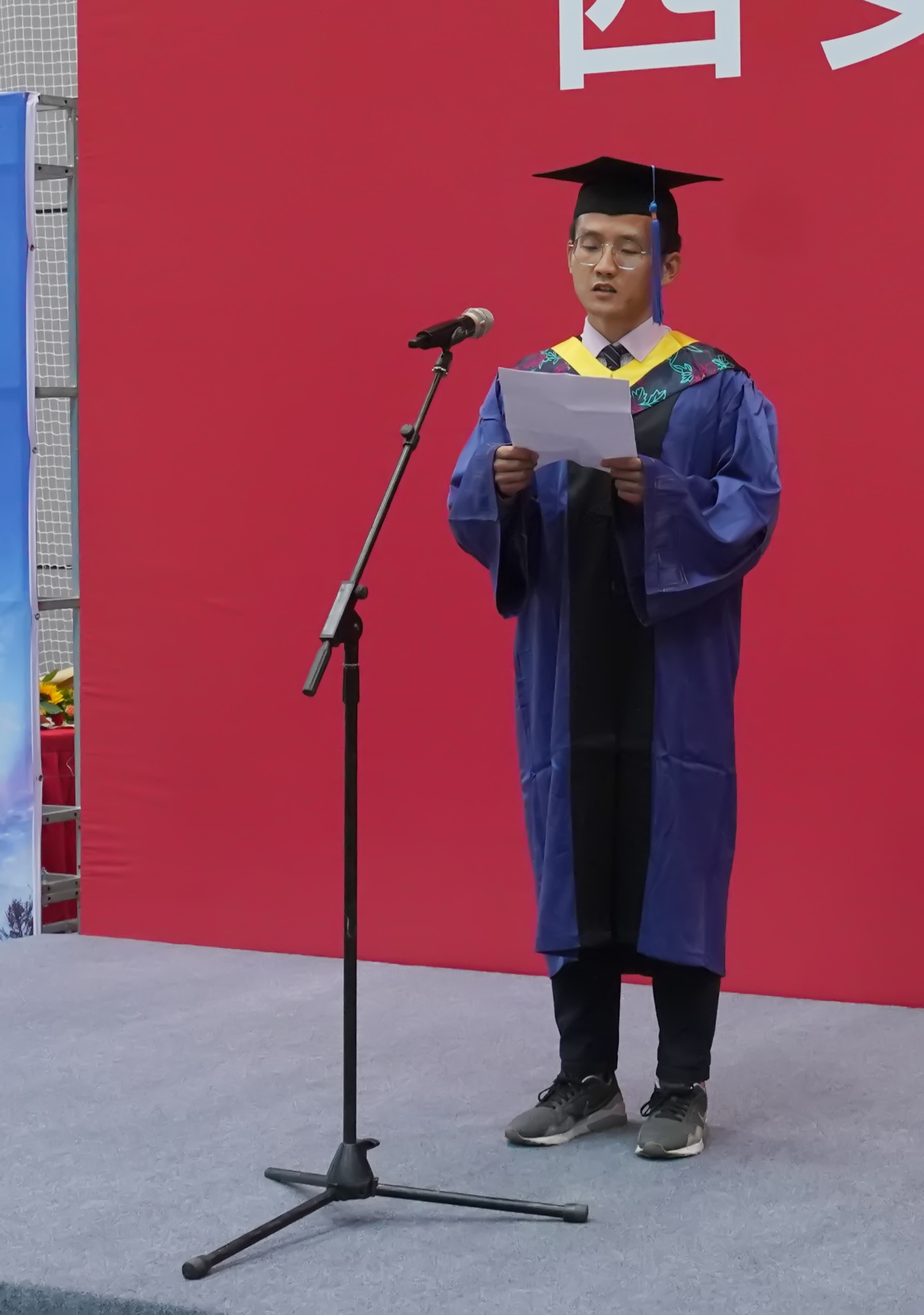 “纵有千古,横有八荒。前途似海,来日方长。”研究生毕业生代表郭新兴同学将美好的祝愿和奋进的力量送给了自己和全体同学,“三年前,我们从五湖四海带着求知的心,美好的梦,相聚到西电。今天,我们又要背负行囊,带着坚定的心从西电走向世界。西电人将在这个时代奋勇而上,用奋斗书写无愧于新时代、无愧于西电人的华彩篇章。”