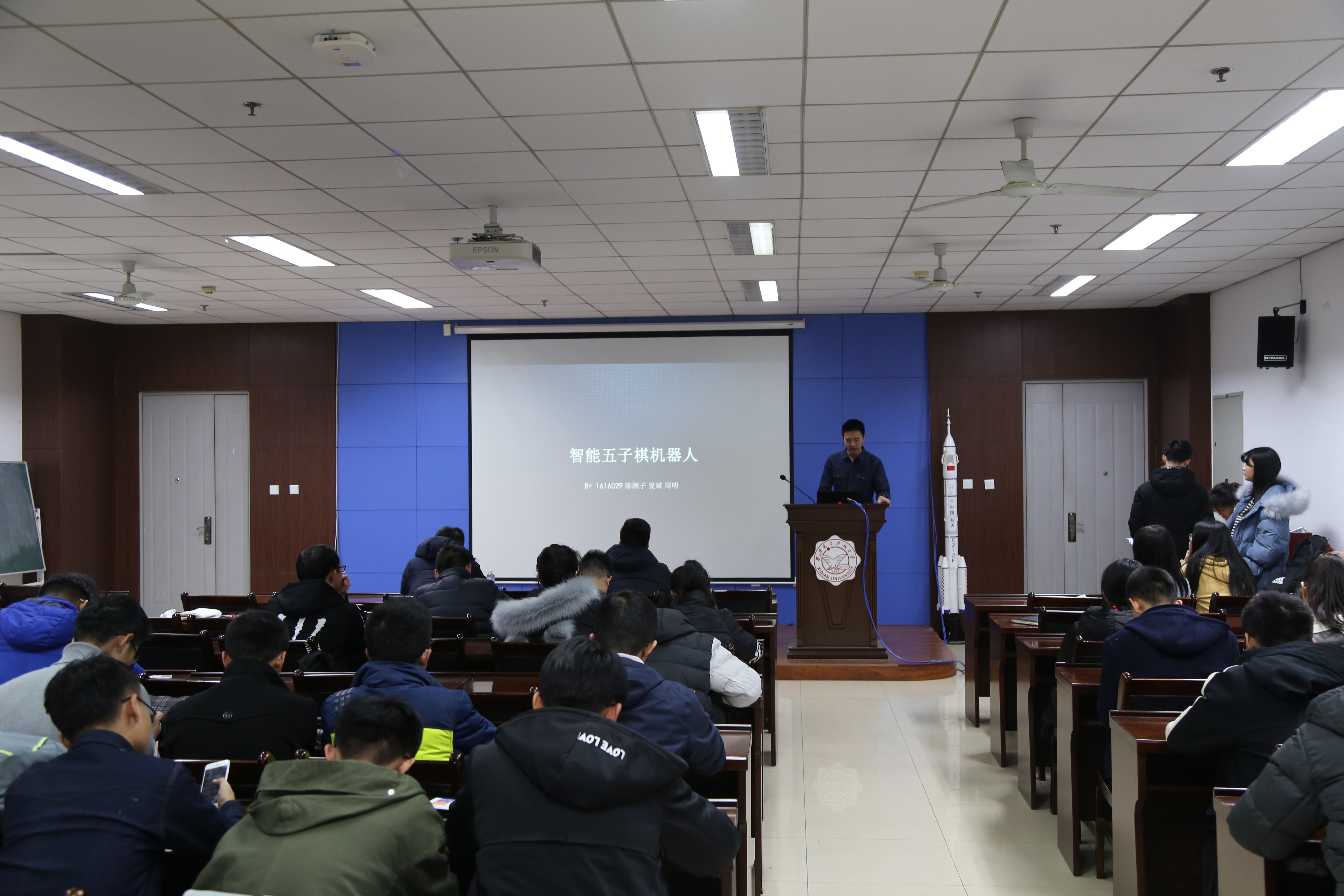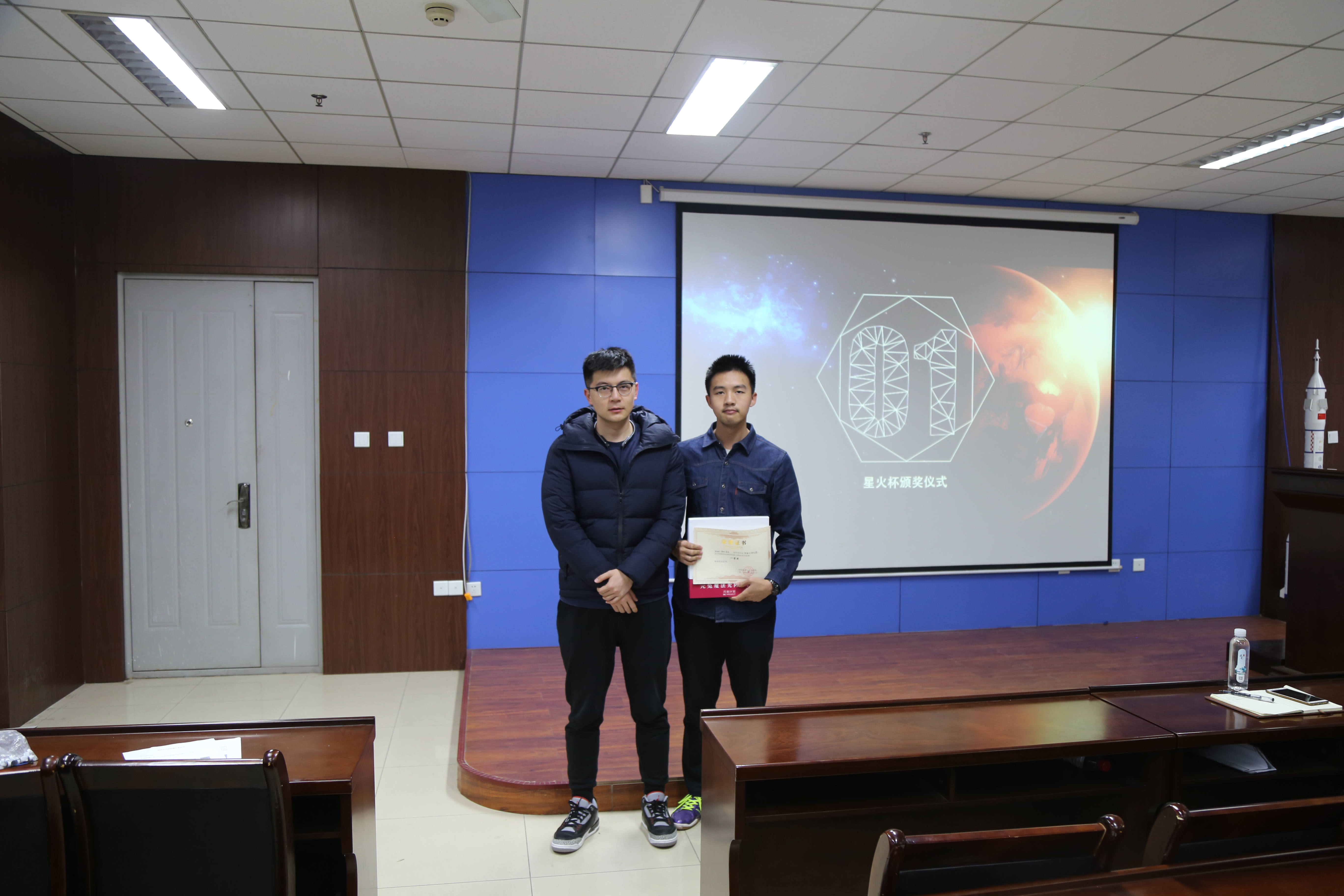 在第30届“星火杯”老员工课外学术科技作品竞赛中,空间学子积极参与、锐意创新,展现出了饱满的创新热情和出众的创新潜力,多项作品进入校赛。在院赛的角逐中,《智能五子棋机器人》作品获得一等奖,《室内环境质量检测报警系统》、《蓄力式超电磁炮》两项作品获得二等奖,《MTGso万智牌卡牌工具》、《基于北斗导航系统的智能小车》两项作品获得三等奖。在颁奖仪式上,刘涛、郑瑞博和科协负责同学分别为获奖团队颁发了证书和奖品。获奖团队就项目特点、创新亮点、技术难点分别进行了介绍并分享了参赛心得。