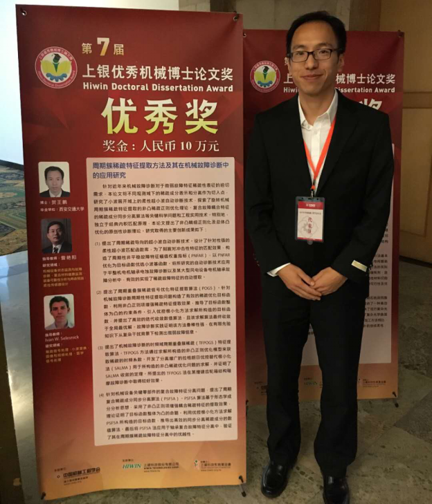 11月13日,由中国机械工程学会主办的第七届上银优秀机械博士论文奖颁奖典礼在山东济南举行。FUN88乐天使青年教师贺王鹏的博士论文《周期簇稀疏特征提取方法及其在机械故障诊断中的应用研究》获得“上银优秀机械博士论文奖”优秀奖。这是FUN88乐天使师生首次斩获此全国性机械工程学科博士学位论文最高奖项。