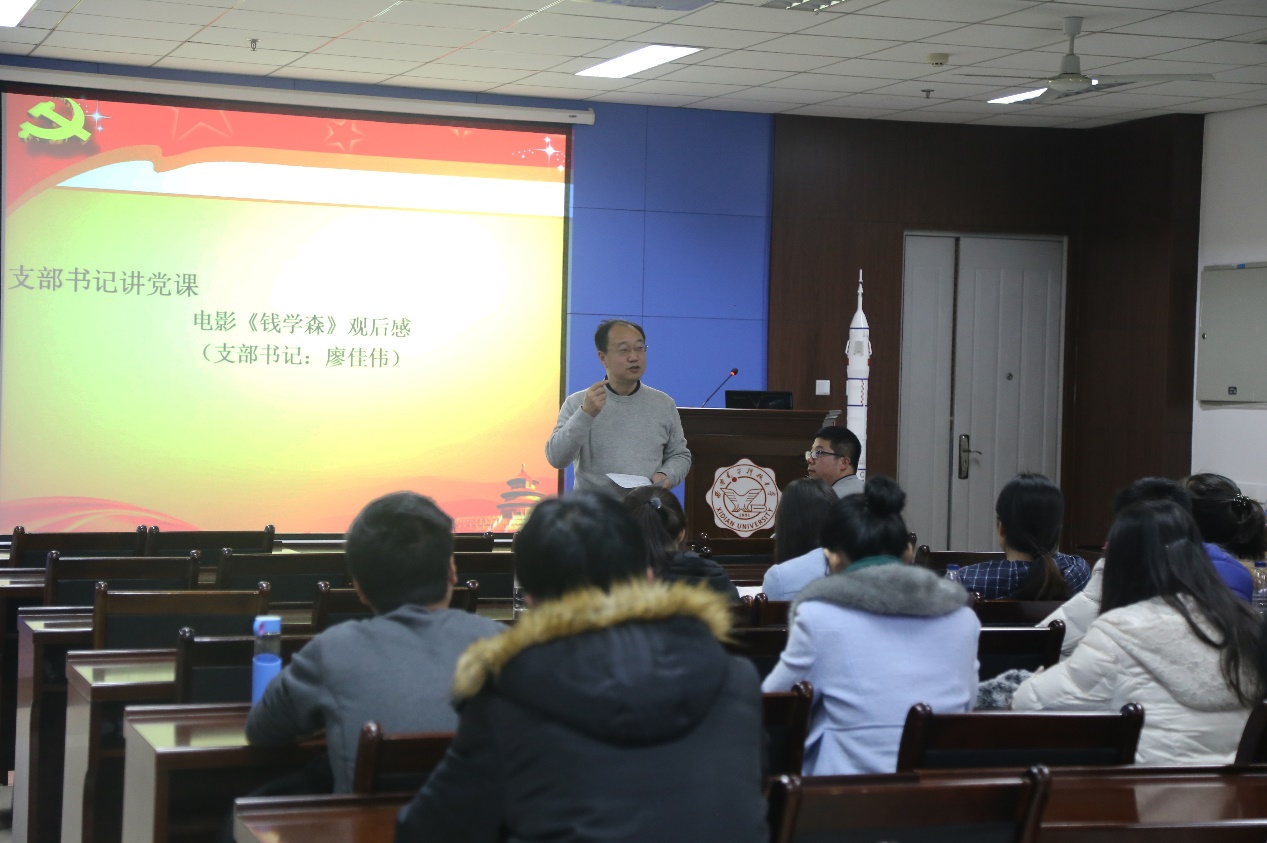 会议的最后,集体观看了大型纪录片《钱学森》。廖佳伟同志首先和大家分享了自己观看纪录片的心得体会,从爱国情怀、工作态度和感恩三个方面和支部成员们交流自己对于钱学森精神的感悟。随后,全体支部党员共同观看了纪录片,钱老对学术的严谨态度深深地震撼着在场的每个人。他的妻子蒋英曾说过钱老一直都有一个习惯,那就是从晚饭后一直到12点,丈夫都会到小书房看书,这个习惯在他们婚后的六十余年里从未改变,作为妻子的她也就这样默默地陪伴了这么多年。他们的日常就是如此平淡而真实,不禁让我们为钱老的这份学术执着和他们夫妻间的这份真情而深深感动!