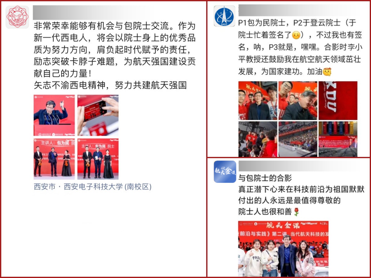 丁香书院电子信息大类员工郭鹏飞谈到:“包为民院士对于很多深奥的航天科技原理讲述的非常透彻,本堂课程的学习不仅让我加深了对于空间科学的认识,航天强国建设也不再仅仅是一个宏观的概念,仿佛成为了一条条具体的现实路径,对于我们而言,可能就是要先从上好每一门基础课开始。”丁香书院电子信息大类员工杨悦彤在朋友圈晒了和包院士的合影,并配以文字“真正潜下心来在科技前沿为祖国默默付出的人永远是最值得尊敬的。”2022级钱学森空间科学实验班的徐程靖则是在朋友圈用“我也是和包院士有合影的人了”分享了自己“追星”激动的心情。