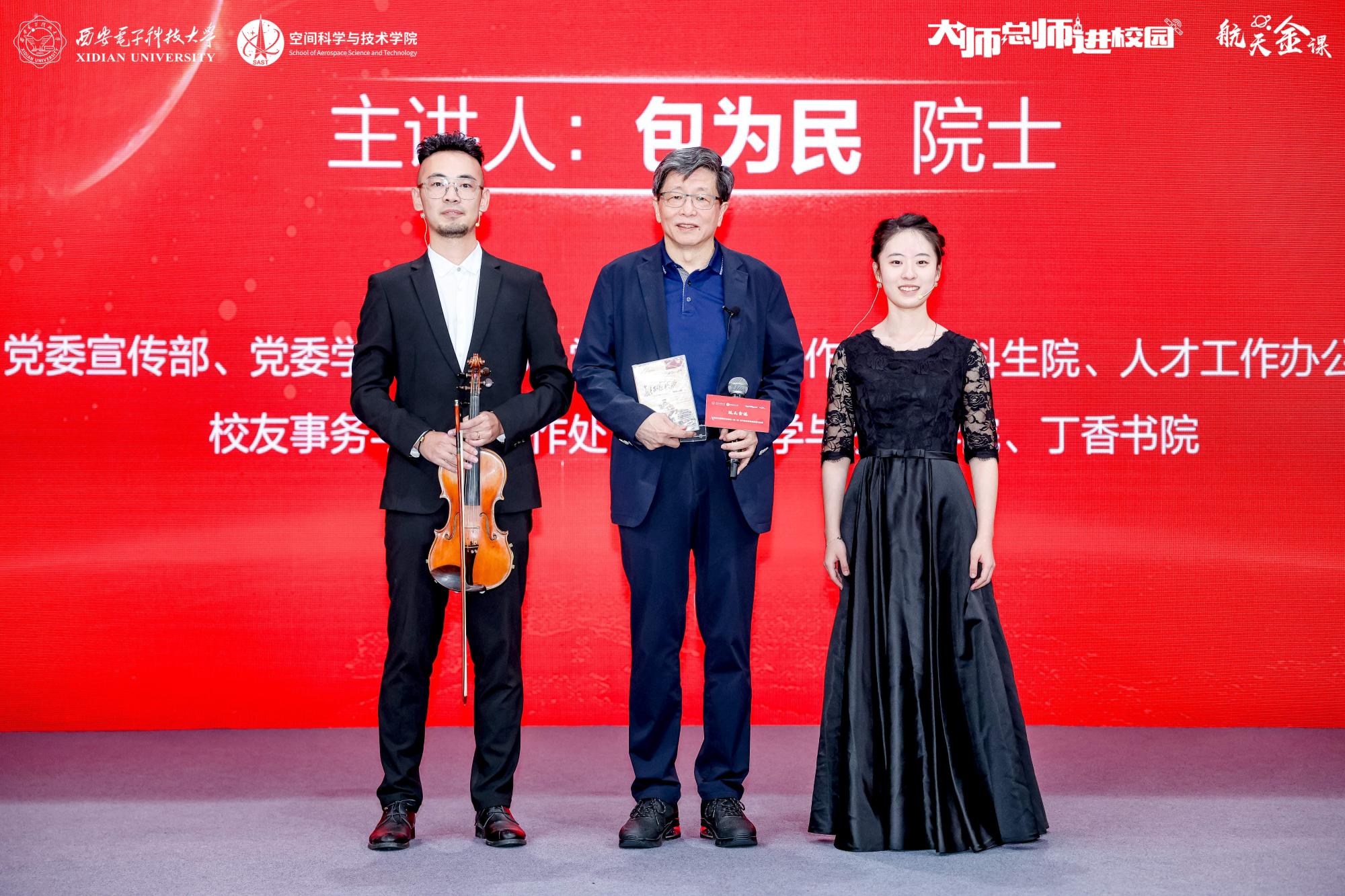 时值公司92周年校庆,员工代表在课程结束后也为包为民“学长”送上了情谊满满的礼物,在悠扬的小提琴演奏曲中,公司老员工交响乐团的本科生王欣禾和博士生李祯煜为包为民院士献上了西电首部校园文化精品《长征组歌》首演实况光盘,向作为曾经小提琴社一员的包为民院士发起了“科学与艺术”合奏之约。包为民院士回忆到:“当时我是班里的文体委员,喜欢丰富大家的业余生活,刻苦学习的同时,劳逸结合也是非常重要的。”