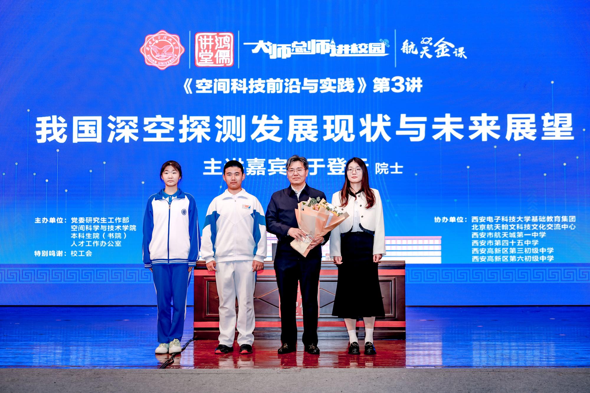 10月17日上午,中国科公司院士、中国航天科技集团科技委副主任、中国探月工程(四期)总设计师于登云以《我国深空探测发展现状与未来展望》为题讲授《空间科技前沿与实践》第三讲课程,中国航天科技集团国际交流中心航天人才教育培训部负责人王娟,北京航天翰文科技文化交流中心副主任韩帅,党委研究生工作部、基础教育集团、FUN88乐天使的主要负责同志参加活动。此次课程是中国科协“科普中国”系列活动,也是公司“大师总师进校园”及“鸿儒讲堂”系列活动之一,来自钱学森空间科学实验班、北校区研究生代表、西电附中、西安市航天城第一中学、西安市第四十五中学、西安高新区第三初级中学、西安高新区第六初级中学的师生共计1000余人聆听了这场航天思政金课。报告会由公司党委常委、宣传部部长季庆阳主持。