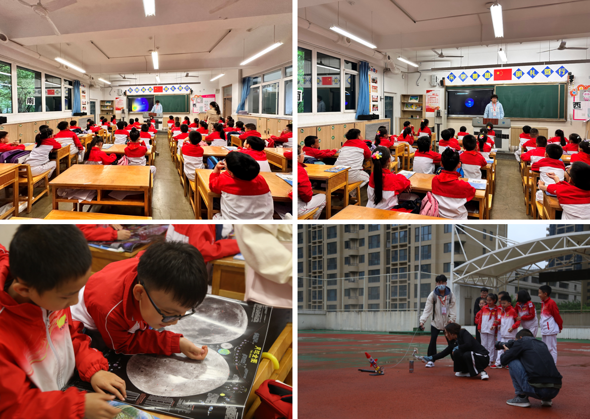 “水火箭为什么能飞?它到底能飞多高?”带着一个个疑问,三年级一班的员工们跟随着志愿者的脚步走向操场,共同开展一场别开生面的水火箭发射实验。“普普通通的塑料瓶,加上水就能飞上天。简简单单的打气筒,打上气就是发射塔。”在志愿者的讲解下,员工们组装的一个个水火箭整装待发,“三二一,发射!”伴随着发射的号令,水火箭腾空而起,“我的水火箭飞的比楼顶还高”“现在我们动手制作水火箭飞向空中,以后我们要一起设计制作真火箭进入太空”,放飞水火箭的同时,“小小少年”们投身航天报国与科技报国的梦想也随之一同启航。